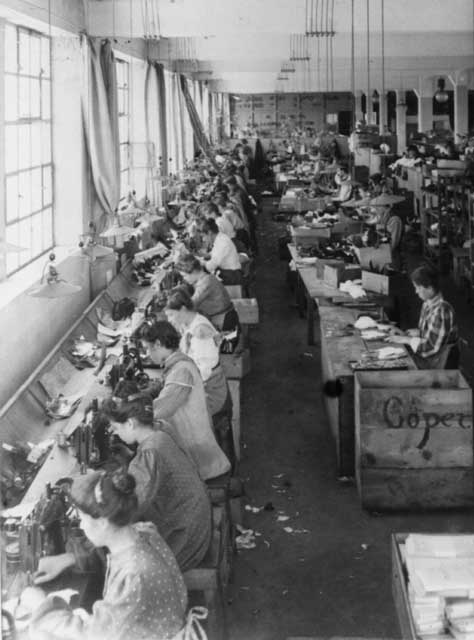 No photos of the Lion Shoe Company are known to be in existence but the conditions inside Lion Shoe were likely similar to those in this unidentified shoe factory. In 1921, there were 1,505 manufacturers of shoes and boots. That year 69.5 million pairs of shoes and boots were made for men and 101.5 million pairs for women.[8] Credit: @1908 Underwood & Underwood. Library of Congress, Prints and Photographs Division [reproduction number LC-USZ62-70774] |