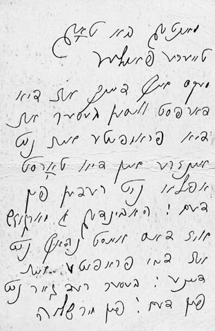 Monday Noon Dear Family: Mr. Gershonen from Keystone, Pennsylvania, visited here and told me that he sold the last car to the Rovners for 10˝ and 310. He does not like to sell cloth to you or to anyone else, as he loses money on the cloth deal. He will contact you when he will come here. Mr. Arnov from Detroit will supply you. He is very devoted to me. He visits me often. He is in the same business as you. He will come to your shop to bring regards from me. If he will ask questions, please tell him the truth, as he will recognize a bluff. From me, |