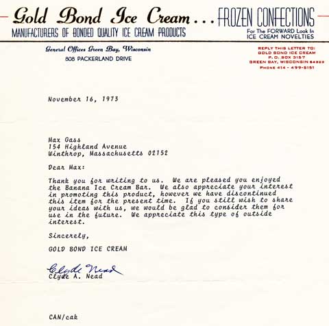 Having enjoyed several of your “Coated Banana Ice Cream,” it occurred to me that your product deserved a better name with which to parade its merits to the public, for whose favor there are many bids when it comes to delicacies.